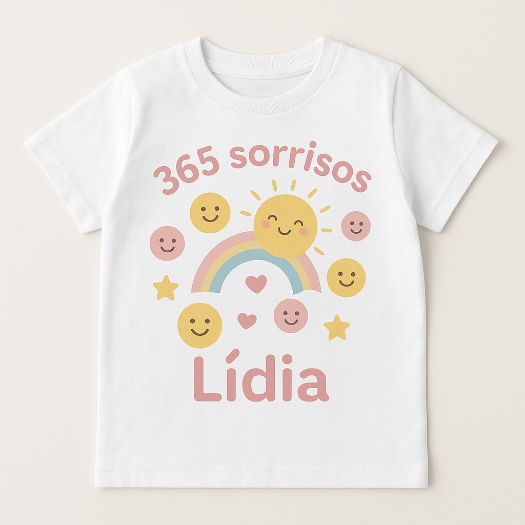 Camiseta infantil personalizada com estampa divertida 365 sorrisos, ideal para aniversários.