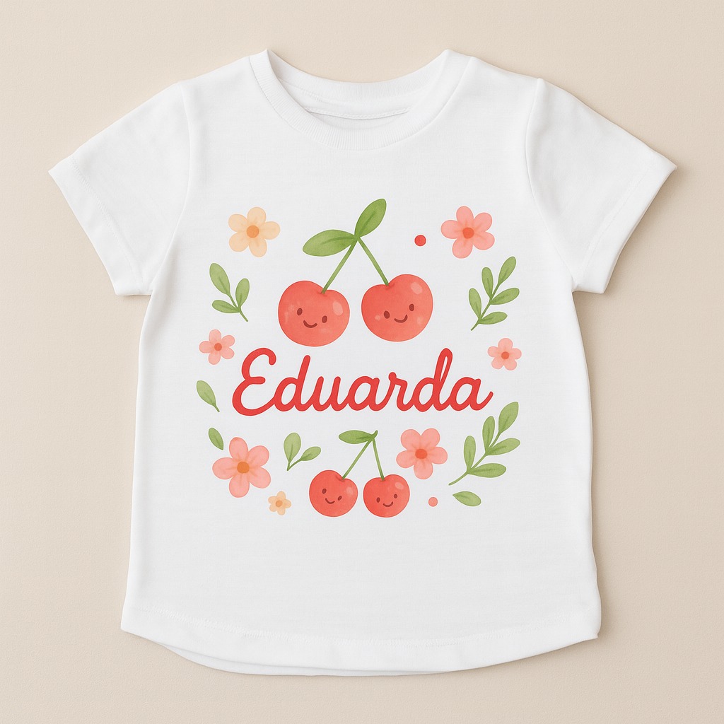 Camiseta infantil personalizada com estampa delicada de cerejas em aquarela.