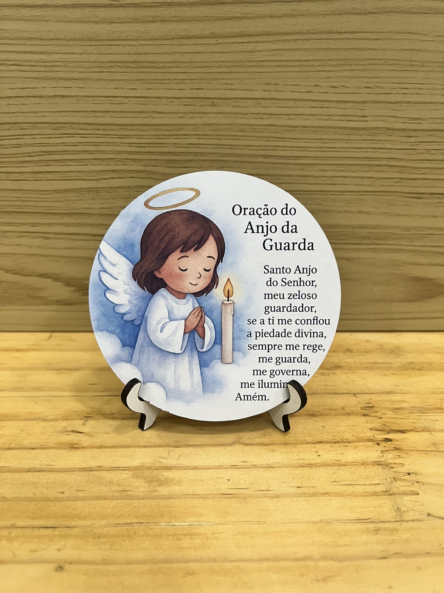 O display possui a tradicional oração do Anjo da Guarda, acompanhada de uma ilustração infantil delicada, perfeita para decorar a mesa do batizado ou presentear os convidados.